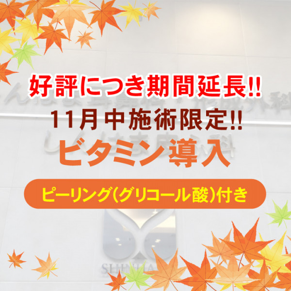 好評につき期間延長!今だけの特別価格!『イオン導入+ピーリングセット』が今なら施術ご予約でピーリング(グリコール酸)を無料サービス✨ビタミン導入+ピーリングが¥3300❣ また、トランサミン導入+ピーリング¥4400❣ もご用意しております。ピーリングで表面の角質をとり、より薬剤が浸透しやすくなります!この機会にぜひお試しください✨ ※11月のキャンペーンになりますので、12月以降に予約入れた方は対象外になります🙇♀️